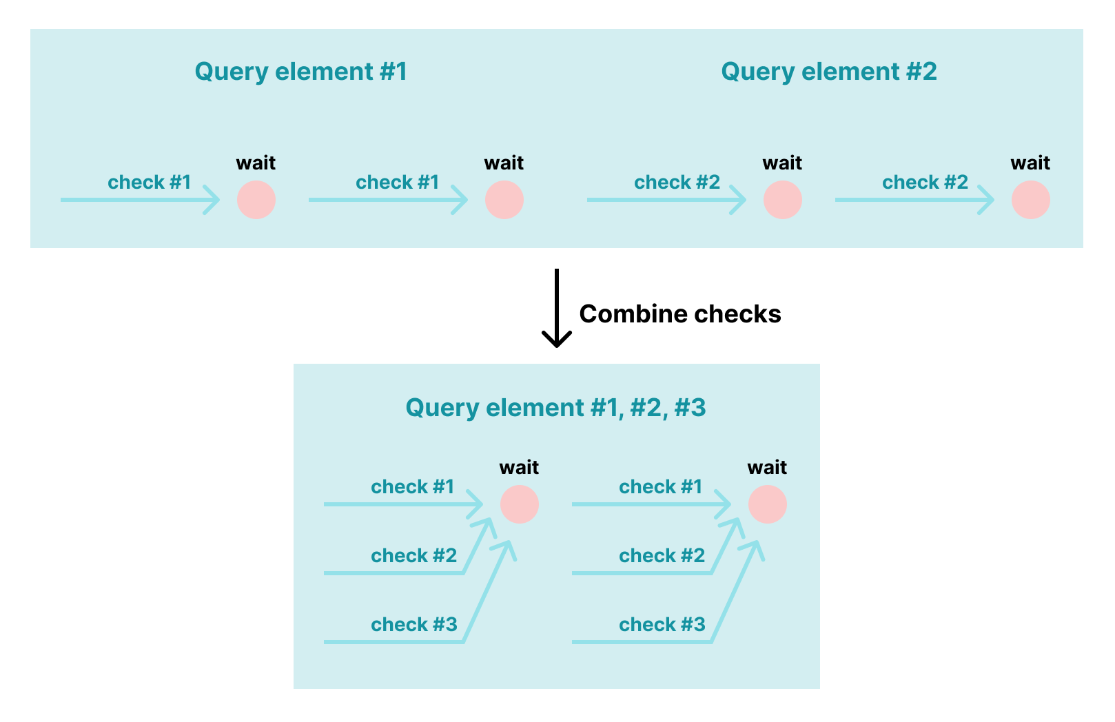 Second, if there are many checks in a UI component, we can combine several checks in one query. Let say, we wish to see 10 elements on the screen. Instead of sequentially checking each element, we can check all elements together in one poll iteration. The polling-check above can be justified for the multiple elements as follows: